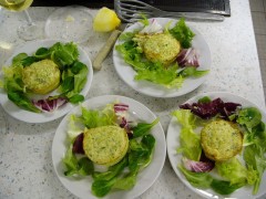 5. Auf Tellern den Salat anrichten, mit Olivenöl und Zitronensaft beträufeln und die gebackenen Blumenkohltörtchen darauf anrichten und servieren.