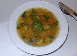 5. Die Suppe in vorgewärmten Tellern servieren, obenauf einen Klecks Pesto geben und mit einigen Basilikumblattchen dekorieren.